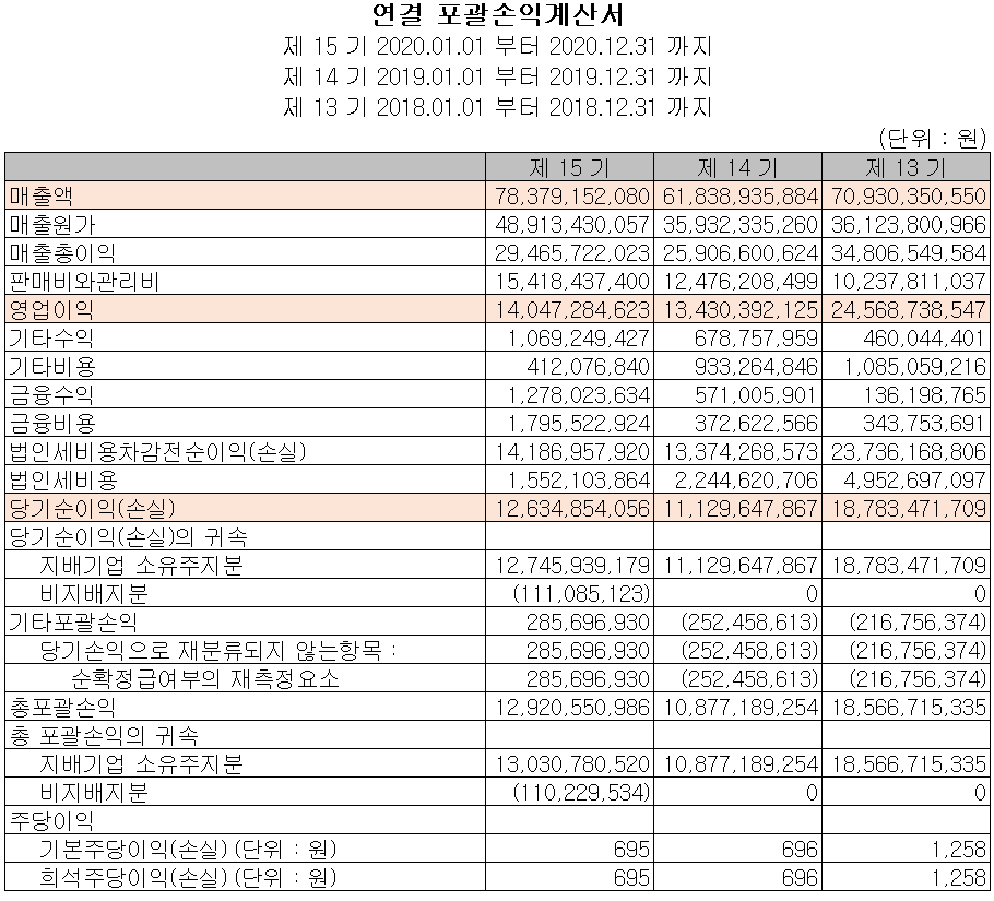 2020년 당사의 실적은 매출액 784억 원으로 전년 대비 26.7% 증가했고, 영업이익은 140억 원으로 4.6% 증가, 당기순이익은 126억 원을 기록하면서 13.5% 증가하였습니다. 코로나19 상황에서도 OLED 및 반도체 소재의 꾸준한 매출 증가에 따른 실적 개선이 있었습니다.