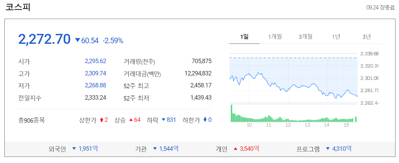 오늘 코스피 시장은 전일 대비 60.54포인트(2.59%) 떨어진 2272.70으로 마감했습니다.