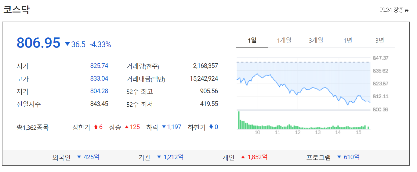 오늘 코스닥 시장은 전일 대비 36.5포인트(4.33%) 빠진 806.95로 큰 폭으로 하락하면서 마감했습니다.