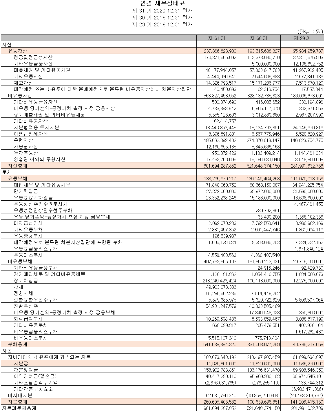 당기 말 현재 당사의 자산총계는 현금성 자산의 증가와 대규모 시설투자에 따른 유형자산의 증가, 종속회사 네패스 라웨가 연결대상으로 포함됨에 따라 전년 대비 53.7% 증가한 8,017억 원을 기록했습니다. 부채는 장기 차입금 및 파생상품 부채 등으로 63.5% 증가하면서 5,411억 원입니다. 파생상품의 부채는 실제 현금 유출이 없는 부채로서 당사의 유동성에 문제가 되지 않습니다.