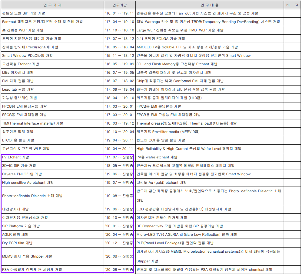 당사는 지난 2020년 전체 매출액의 8.74%에 해당되는 비용을 연구개발에 투자하는 등 지속적인 연구 개발로 반도체, 디스플레이 및 2차전지 관련 산업에 대응하고 있습니다.