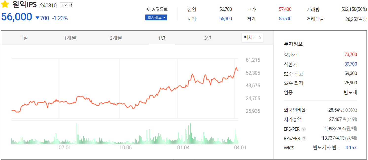 원익IPS가 코스닥 시장에서 강세다.[그래픽=홍승완 기자]2일 한국거래소에 따르면 원익IPS는 오전 9시 20분 기준 전 거래일 대비 4.63%(2500원) 오른 5만6500원에 ...