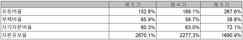 당기 말 기준 유동비율은 152.8%, 부채비율은 65.9%, 자기자본비율 60.3%, 자본 유보율은 2,670.1%를 기록하면서 전반적으로 양호한 재무상태를 유지하고 있습니다.