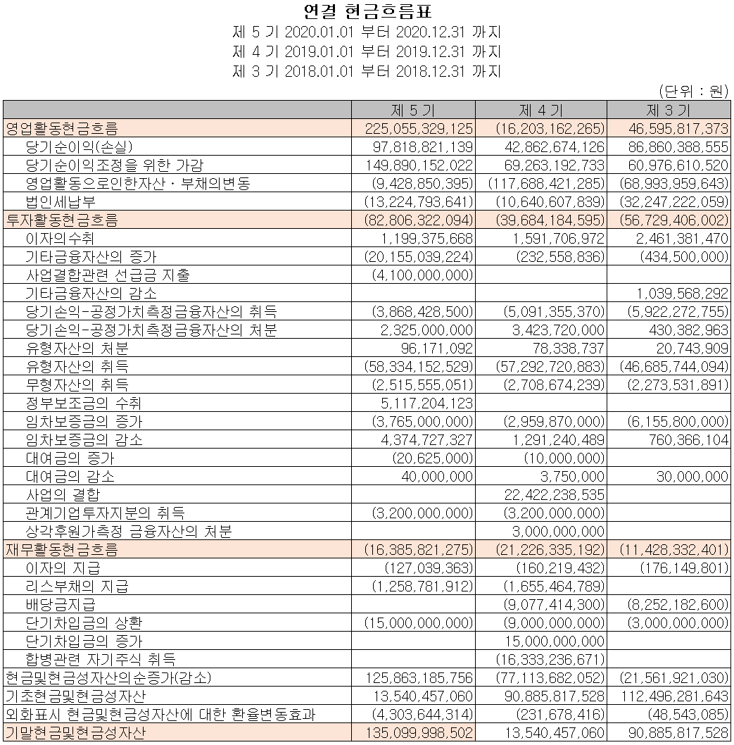 반도체 사이클 침체기였던 2019년의 실적을 뒤로하고 당기 실적이 크게 증가하면서 영업활동으로 인한 현금흐름이 플러스로 전환되었으며, 신규 장비의 개발 및 설비 투자를 지속적으로 진행하고 있습니다. 2020년 당기 말 기준 현금성 자산은 1,350억 원입니다.