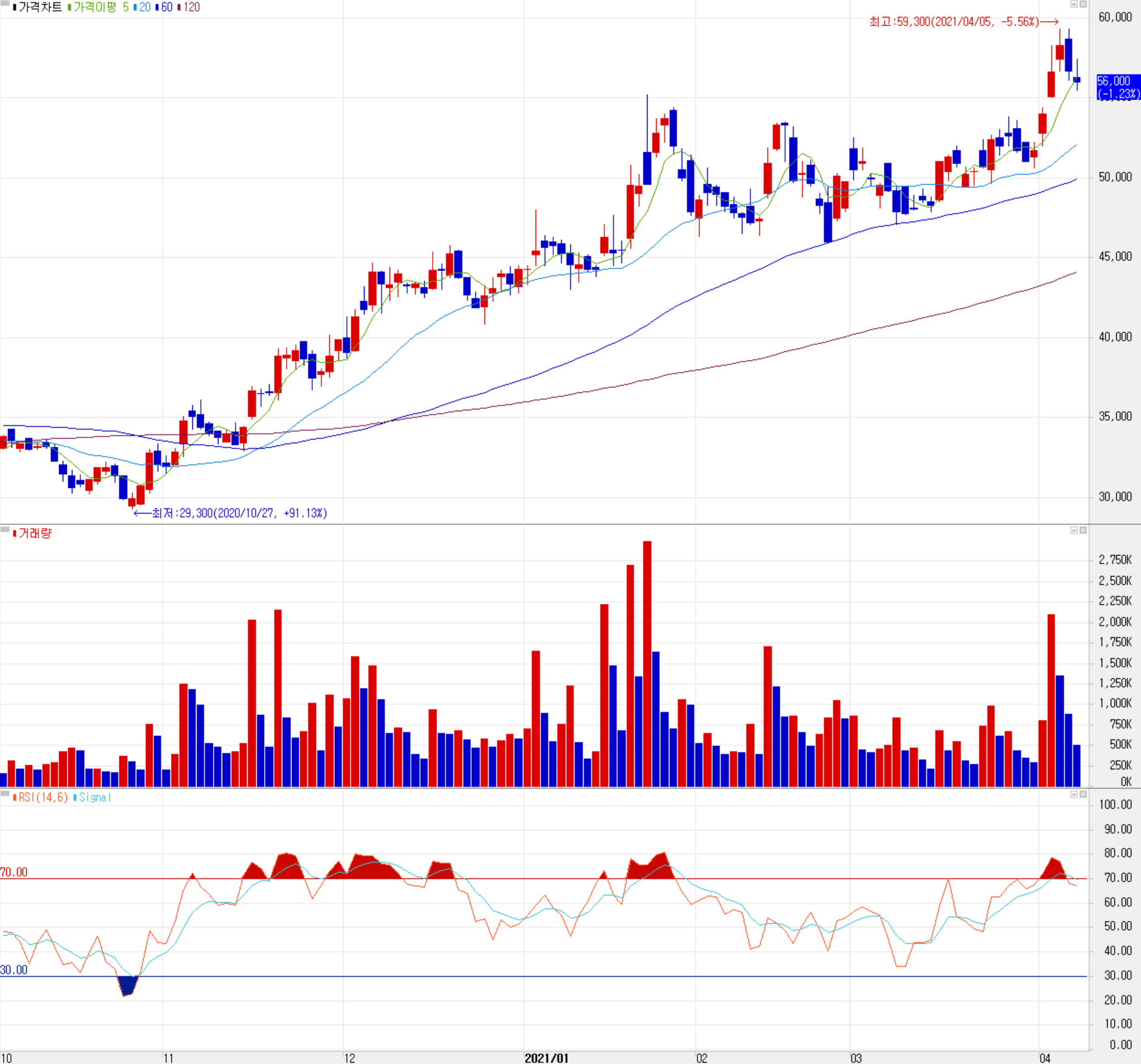 당사의 주가는 지난해 3월 코로나19로 인한 급락 이후 IT 수요 급증에 따른 반도체 설비 투자 확대로 꾸준한 상승 추세를 이어오고 있습니다. 최근 한 달간 수급에서는 연기금을 비롯한 기관계의 매수세가 유입되고 있습니다. 시장의 조정에는 아랑곳하지 않고 지난 3월 18일 단기 골든크로스를 형성한 후 상승하다가 최근 2 거래일 조정을 받고 있는 상황입니다. 개인적으로는 단기 급등에 의한 조정으로 판단되며, 목표 주가는 6,9000원으로 설정했고, 추가 조정 시에는 53,000원을 지지로 보고 있습니다.