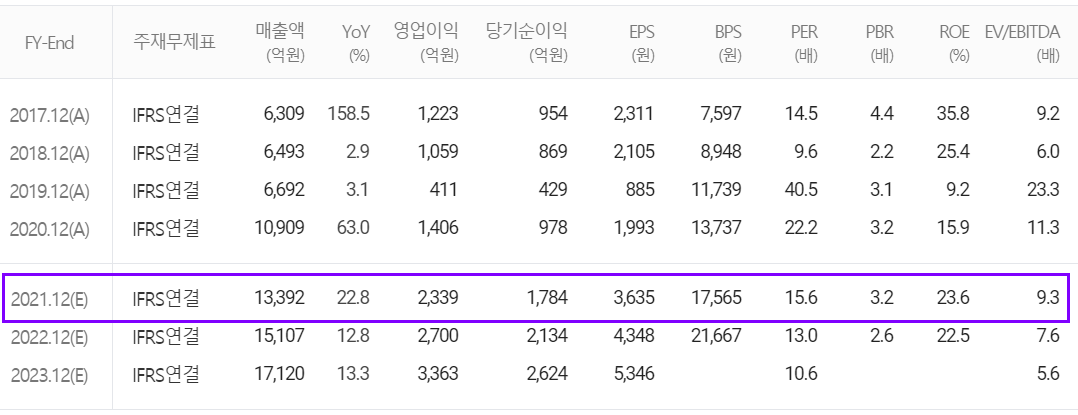 2020년 매출액 1조 클럽이 된 원익IPS의 2021년 컨센서스는 매출액 1조 3,392억 원으로 전년 대비 22.8% 증가하고, 영업이익은 2,339억 원으로 66.35% 증가, 당기순이익 1,784억 원으로 82.41% 증가할 것으로 추정했습니다. 2017년부터 완만한 성장세를 이어오다가 2020년 반도체 슈퍼사이클의 도래에 따른 가파른 성장을 이어갈 것으로 내다보고 있습니다.