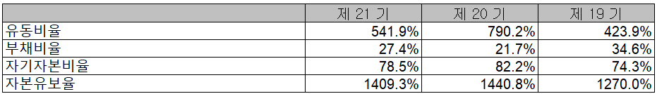 당사의 지난 2020년 재무 안정성 비율에서는 유동비율 541.9%, 부채비율 27.4%, 자기자본비율 78.5%, 자본유보율 1,409.3%를 기록하면서 전반적으로 안정적인 재무구조를 유지하고 있습니다.