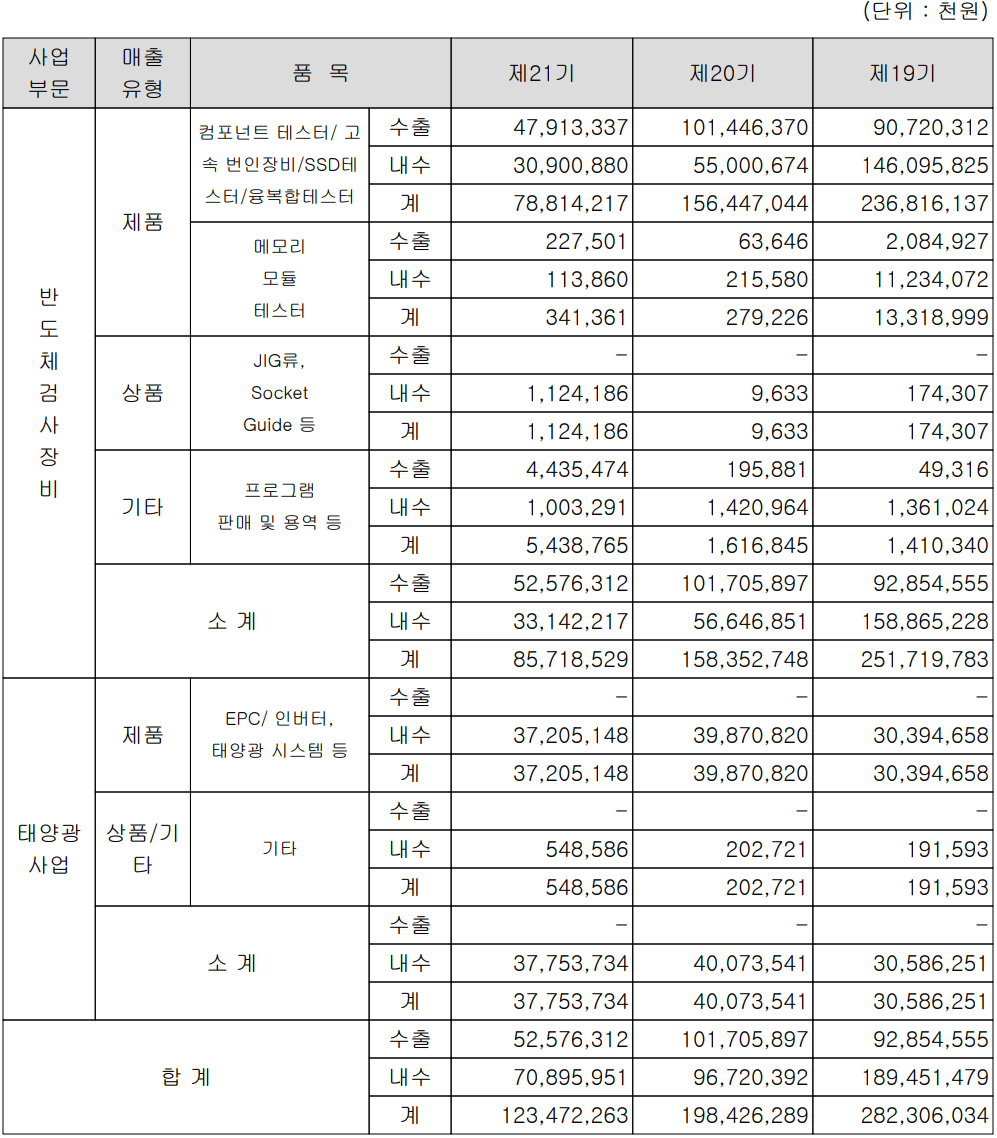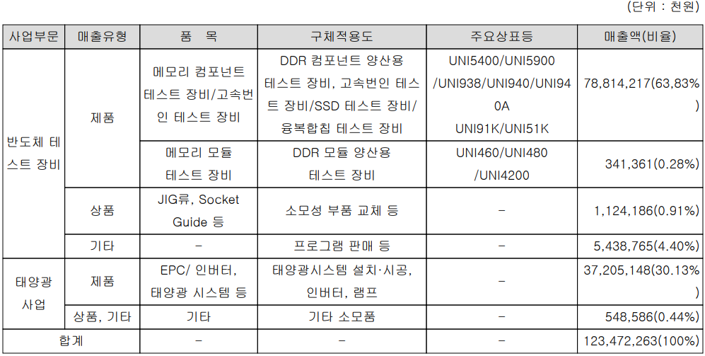당사의 사업 부문은 크게 반도체 검사 장비와 태양광 사업으로 구분됩니다. 반도체 사업에는 Memory Component Test 및 Burn-In Test 장비, SSD 테스트, 융복합 칩의 테스트 장비 등이 있으며 기타 공정 장비와 관련된 소모성 부품의 공급 등이 있습니다. 태양광 사업은 EPC, 즉 당사는 설계(Engineering)부터, 조달(Procurement), 시공(construction)까지 자체 내에서 원스톱으로 솔루션을 제공할 수 있으며, 기타 부속품과 소모품 등을 공급하고 있습니다. 반도체 사업 부문의 매출은 전체 매출의 63.83% 비중을 차지하였고, 태양광 사업 부문은 37.2%를 나타냈습니다.