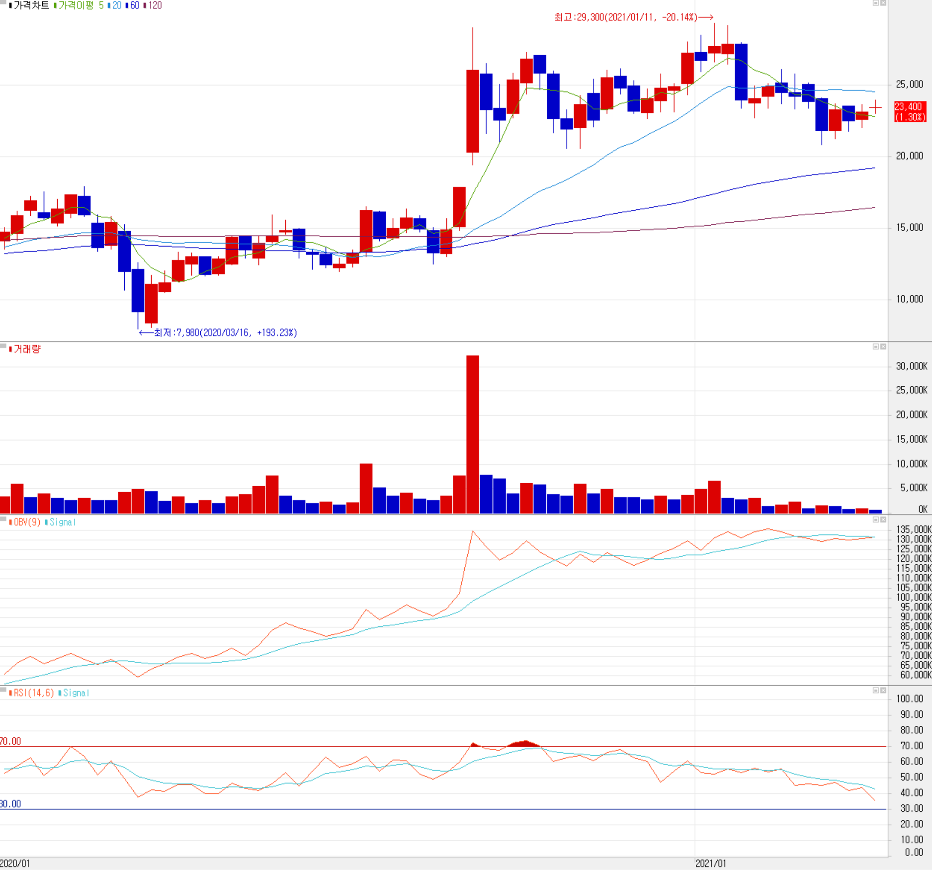 당사의 주가는 코로나19 팬데믹으로 인한 급락 후 풍부한 시장 유동성과 정부 정책 및 반도체 산업의 회복 전망이 나오면서 빠르게 회복했습니다. 이후 9월 들어서면서 당사의 태양광 사업(페로브스카이트 태양전지 및 유리창호형 사업과 한전과 협력 개발) 소식이 전해지면서 단숨에 2배 가까운 급등을 했습니다. 이후 등락을 반복하다가 11월부터는 반도체 슈퍼사이클 등의 호재에 따라 삼성전자, SK하이닉스를 중심으로 반도체 업종에 수급이 몰리면서 1월에는 최고가인 29,300원을 터치했고, 이후 시장 전반의 수급 조정과 함께 하락세를 보이다가 최근 반등을 시도하고 있습니다. 최근 한 달간 수급에서는 외국인과 개인의 매수 우위 가운데 기관은 매도 우위를 보이며, 특히 연기금은 한 달 동안 거래가 있던 날은 모두 순매도를 보였습니다.