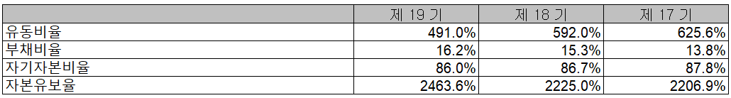 당사의 2020년 당기 말 기준 유동비율은 491%, 부채비율 16.2%, 자기자본비율 86% 및 자본 유보율 2,463.6%를 기록하면서 전반적으로 안정적인 재무 상태를 유지하고 있습니다.