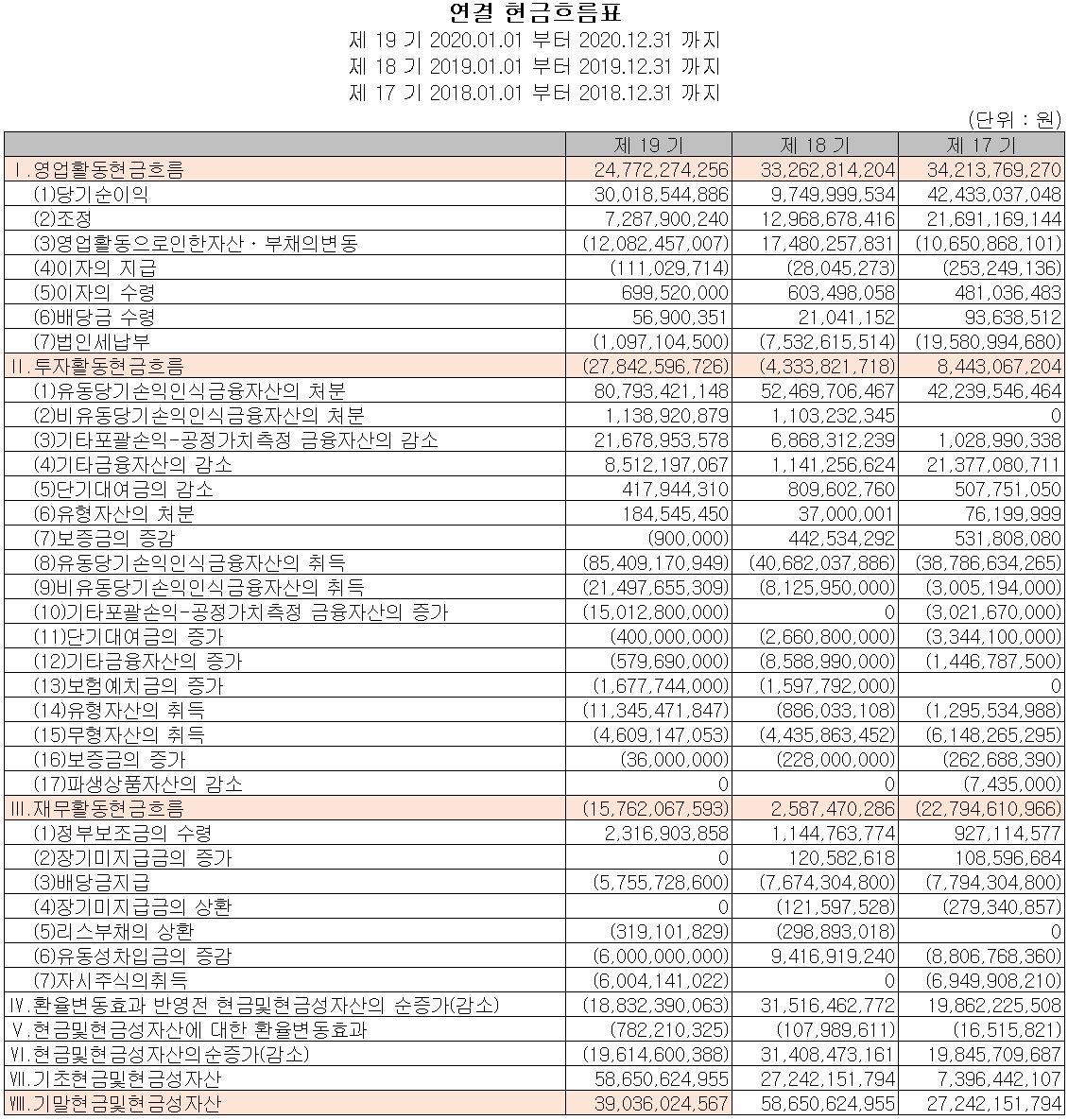 영업활동으로 인해 창출된 현금과 자산으로 신규 투자를 진행하고 있으며, 배당금(57.5억 원)을 지급했고, 부채를 상환하는 등 의 재무활동을 진행하였습니다. 2020년 당기 말 현재 당사의 현금성 자산은 390억 원을 보유하고 있습니다.