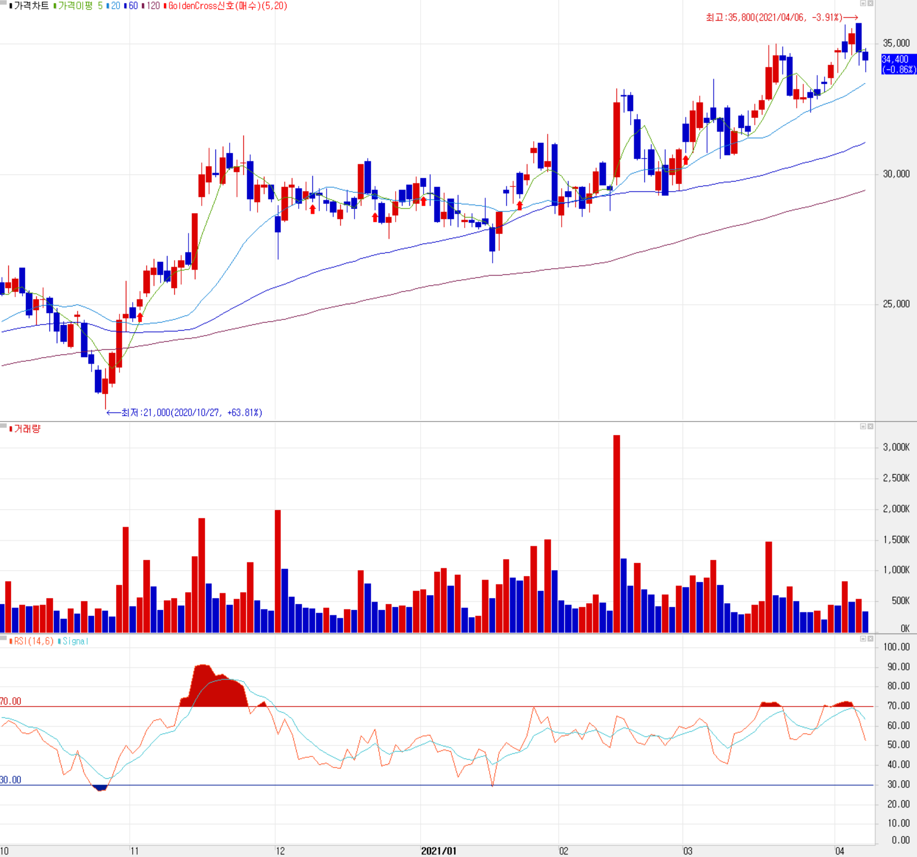 당사의 주가 흐름을 보면 2020년 3월 코로나19로 인한 급락 이후 반등하면서 현재까지 상승추세를 이어오고 있습니다. 현재 이평선 정배열 상태가 진행 중이나 4월 6일 외국인의 매도세로 주가는 5일선 밑으로 내려온 상황입니다. 최근 한 달간 수급에서는 외국인과 기관의 매수세가 유입되고 있으며, 개인은 매도 우위를 보이고 있습니다. 특히 최근 8 거래일 연속해서 연기금의 순매수가 이어지고 있습니다. 2021년 컨센서스와 기술적인 검토의 중간 값을 통해, 개인적인 목표주가는 39,500원으로 설정하였으며, 상승 추세 이탈 시 32,700원 ~ 31,500 구간에서 재점검이 필요해 보입니다.
