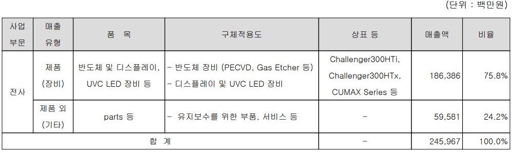 당사의 사업 부문은 반도체의 전공정에 관련된 증착, 식각 등에 관련된 장비와 디스플레이 박막 봉지 공정용 장비 및 UVC LED용 증착 장비 부문 등으로 구분됩니다. 제조용 장비 부문의 매출은 75.8%의 비중을 차지하며, 장비의 유지보수를 위한 부품과 서비스 용역 부문 매출이 24.2%를 차지하였습니다.