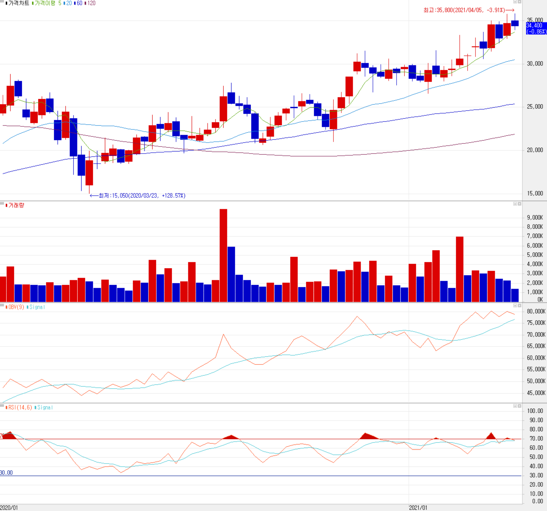 당사의 주가 흐름을 보면 2020년 3월 코로나19로 인한 급락 이후 반등하면서 현재까지 상승추세를 이어오고 있습니다. 현재 이평선 정배열 상태가 진행 중이나 4월 6일 외국인의 매도세로 주가는 5일선 밑으로 내려온 상황입니다. 최근 한 달간 수급에서는 외국인과 기관의 매수세가 유입되고 있으며, 개인은 매도 우위를 보이고 있습니다. 특히 최근 8 거래일 연속해서 연기금의 순매수가 이어지고 있습니다. 2021년 컨센서스와 기술적인 검토의 중간 값을 통해, 개인적인 목표주가는 39,500원으로 설정하였으며, 상승 추세 이탈 시 32,700원 ~ 31,500 구간에서 재점검이 필요해 보입니다.
