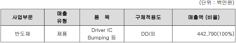 당사의 사업 부문은 반도체 후공정의 핵심 기술인 범핑 공정, COG, COF 조립 공정 기반 기술의 반도체 후공정 관련 단일 사업부문으로서 DDI(Display Driver IC), CIS 범핑 및 모바일 AP용 PMIC 등으로 구분됩니다.