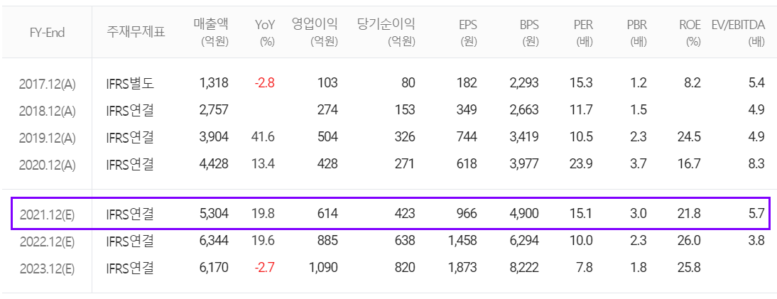 당사의 2021년 컨센서스는 매출액 5,304억 원으로 전년 대비 19.8% 증가하고, 영업이익은 614억 원으로 43.5% 증가, 당기순이익 423억 원으로 56% 증가할 것으로 추정했습니다. 주력사업인 DDI의 회복과 함께 PMIC 및 CIS, AP 등의 신규 사업에 대한 실적 확대를 적용한 것으로 보입니다.