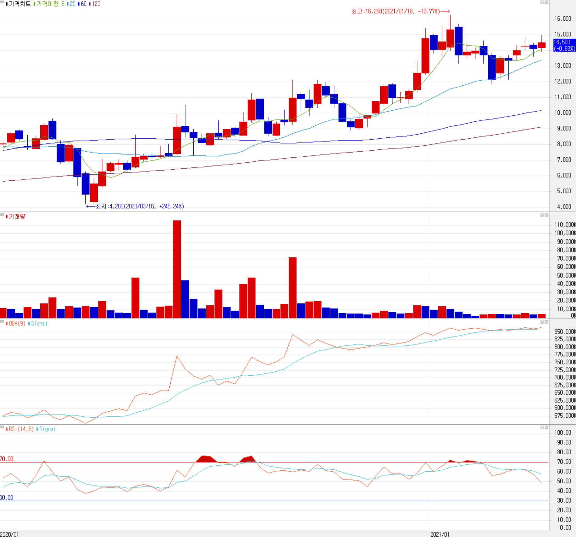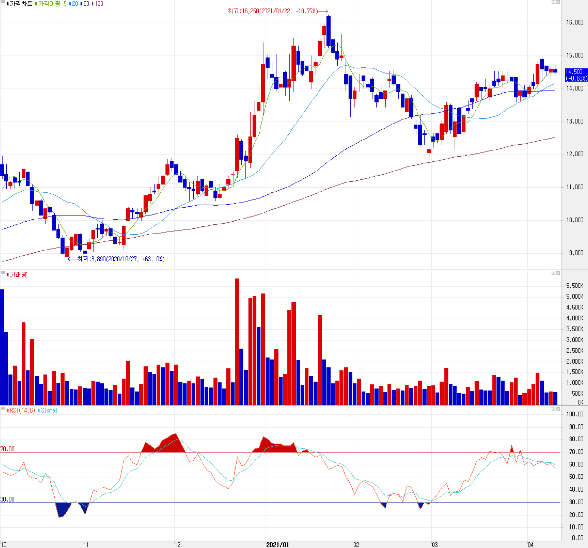 당사의 주가는 지난해 3월 코로나19 팬데믹으로 인한 급락 이후 꾸준히 상승하다가 11월 들어서면서 반도체 전방산업의 빅사이클 도래 등 밝은 전망과 함께 풍부한 수급 등으로 주가는 1월 22일 장중 최고치인 16,250원을 기록하였습니다. 이후 조정을 받으면서 12,000원 아래를 내주다가 반등하면서 최근에는 14,000원 대에서 움직이고 있습니다. 지난달 중순 단기 이평선 골든크로스가 발생하면서 일봉은 좀 더 지켜봐야겠지만 주봉상 비교적 안정적인 정배열 상태가 되었습니다. 2021년 컨센서스 및 기술적 소견을 바탕으로 한 개인적인 목표주가는 19,000원으로 설정하고, 16,000원 부근에서 저항이 예상되며, 하락 시 13,500원을 지지로 보고 있습니다.