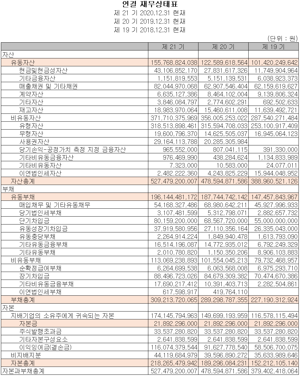 2020년(21기) 당사의 자산 총계는 전년 대비 10.2% 증가한 5,275억 원입니다. 지난해 매출액 증가에 따른 매출 채권과 현금성 자산의 증가가 자산 증가의 주요 요인으로 파악됩니다. 부채는 전년 대비 6.9% 증가한 3,092억 원으로 설비 투자를 위한 차입금 증가가 있었습니다.