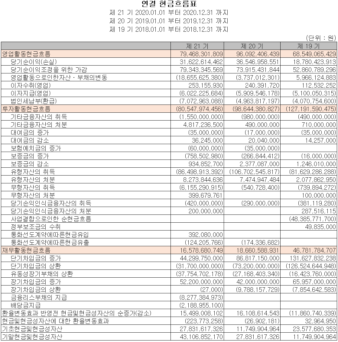 당사는 영업활동으로 꾸준히 현금을 창출하고 있으며, 차입금을 통한 신규 사업의 투자 활동을 하였습니다. 차입금의 상환 및 조달 그리고 배당금 지급 등의 재무활동도 이루어지고 있습니다. 2020년 당기 말 현재 당사의 현금성 자산은 431억 원입니다.