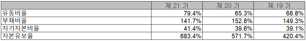 2020년 결산 기준 당사의 유동비율은 79.4%, 부채비율은 141.7%, 자기자본비율은 41.4%, 자본유보율 683.4%를 기록했습니다. 전반적으로 부채비율을 낮출 필요는 있겠으나, 신규 사업(CIS, AP)에 대한 성장으로 보다 안정적인 재무구조를 기대해볼 수 있겠습니다.