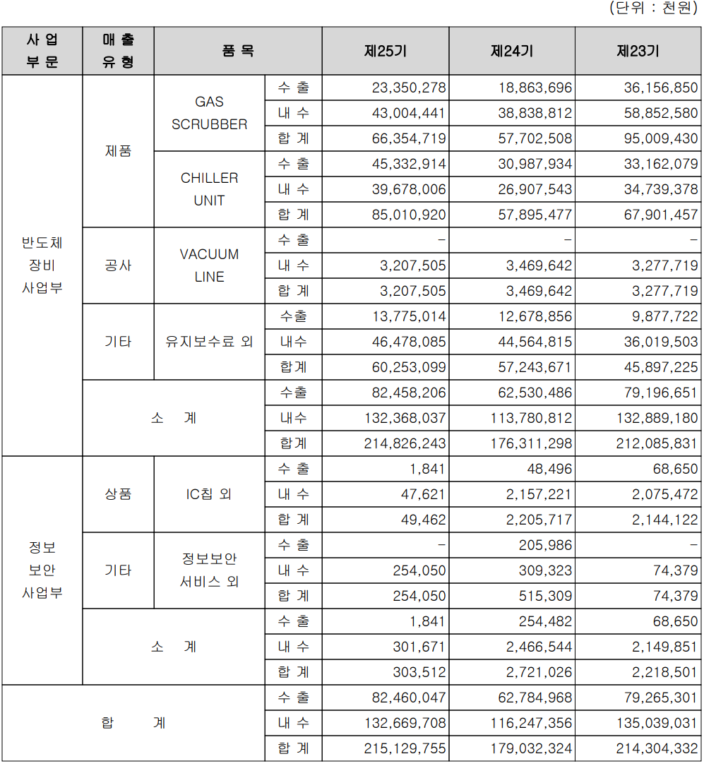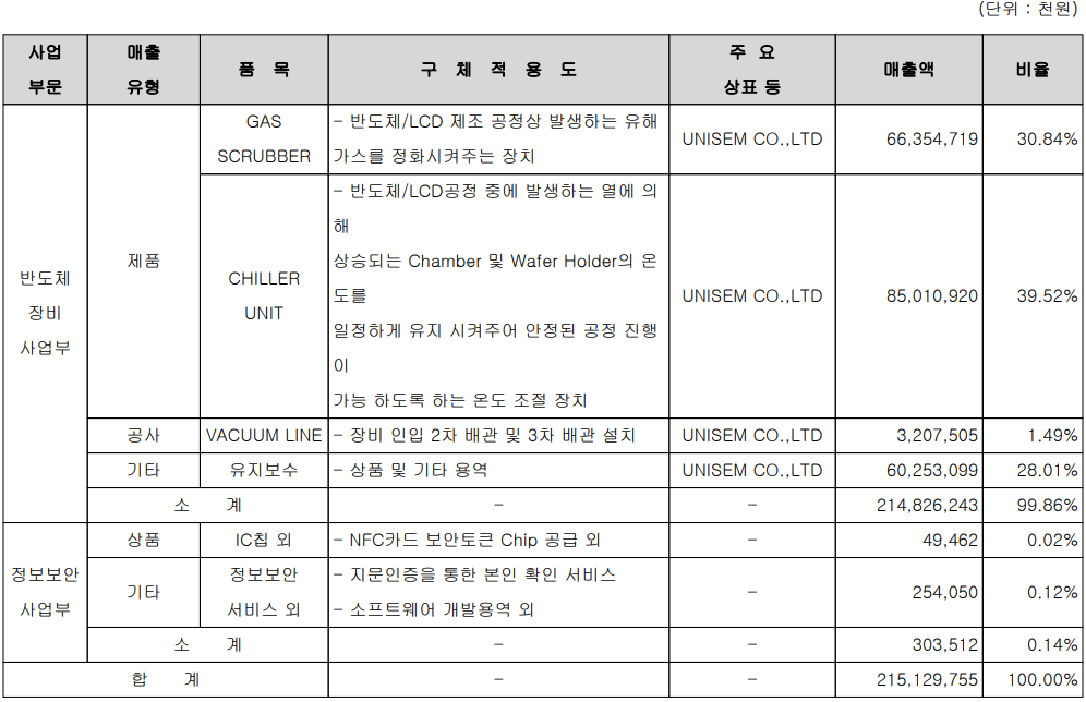 지난해 반도체 장비 사업부문의 매출은 Gas Scrubber 가 30.84%, Chiller Unit 39.52% 의 매출 비중을 보이면서 기타 용역 공사 포함 99.86%의 비중을 보이고 있습니다. 2016년 신설된 정보보안 사업부는 지문 인식 기반 기술의 인증 솔루션 등 보안 관련 사업으로서 전체 매출 비중이 0.14%로 미미하지만, 조달청 나라장터 지문 카드 등을 공급, 지원하면서 사업영역을 확대하고 있습니다.