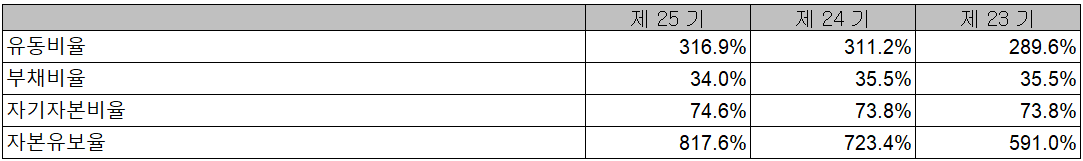 2020년 전반적인 재무 안정성 비율에서는 유동비율 316.9%, 부채비율 34%, 자기자본비율 74.6% 및 자본유보율 817.6%를 기록하면서 안정적인 재무상태를 유지하고 있습니다.