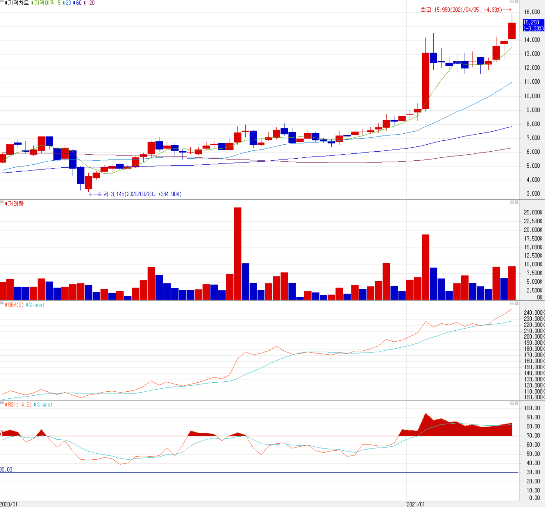 지난해 3월 코로나19로 급락했다가 회복된 당사의 주가는 1월 중순까지는 완만한 상승을 보이다가 중순부터 1월 말까지 급등했습니다. 반도체 전방산업의 투자 확대와 당사의 1분기 예상 실적이 사상 최대치를 기록할 것이라는 전망이 주요 상승의 원인으로 파악됩니다. 이후 주가는 이렇다 할 조정도 받지 않고 12,000원대에서 횡보하다가 최근 이평선 정배열 상태를 만들면서 다시 상승 추세로 전환하는 움직임을 보이고 있습니다. 최근 한 달간 수급에서는 연기금을 위주로 한 기관이 한 달간 20 거래일 순매수를 보이고 있으며, 외국인과 개인은 매도 우위입니다. 급등에 따라 잠시 쉬어갈 수도 있겠으나, 추세는 유효하다고 판단됩니다. 컨센서스 및 차트 관점상 개인적인 목표 주가는 18,500원이며, 반도체 전방산업을 중심으로 당사의 실적 연관성을 수시로 검토하면서 주가 흐름에 대처할 예정입니다. 16,200원 부근에서 저항이 예상되며, 추세 이탈 시 13,500원을 지지로 보고 있습니다.