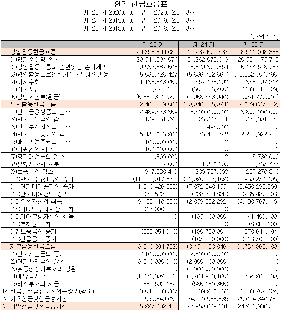 영업활동에서 현금을 꾸준히 창출하고 있으며, 부채의 상환 및 배당금 지급을 하였습니다. 2020년 당기 말 기준 당사의 현금성 자산은 560억 원입니다.