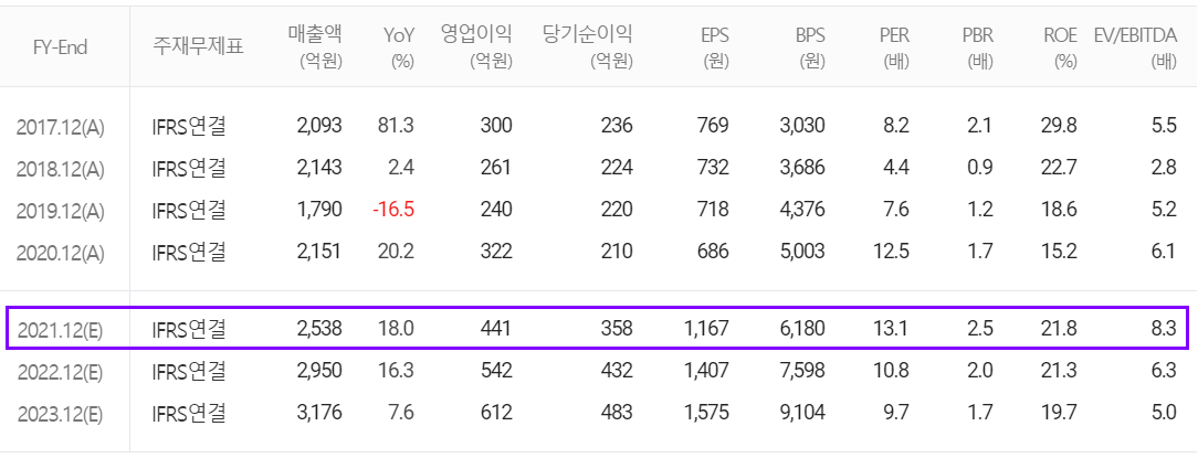 유니셈의 2021년 컨센서스는 매출액 2,538억 원으로 전기 대비 18% 증가하고, 영업이익 441억 원으로 37% 증가, 당기순이익은 358억 원을 기록하면서 70% 증가할 것으로 추정했습니다.