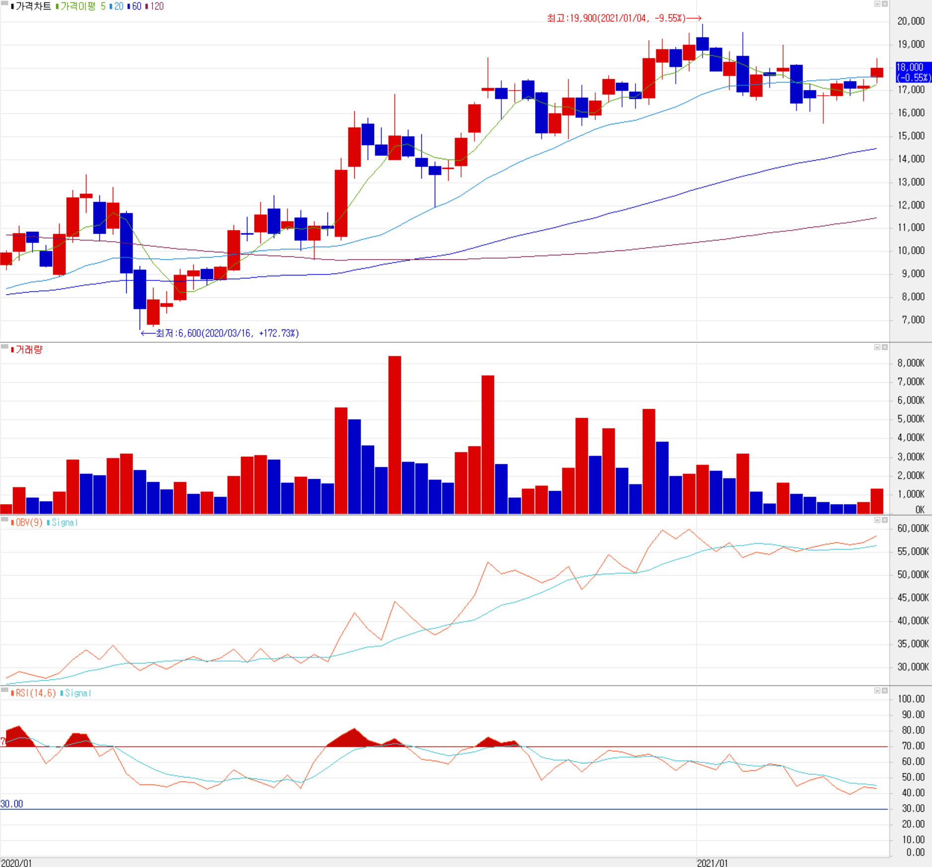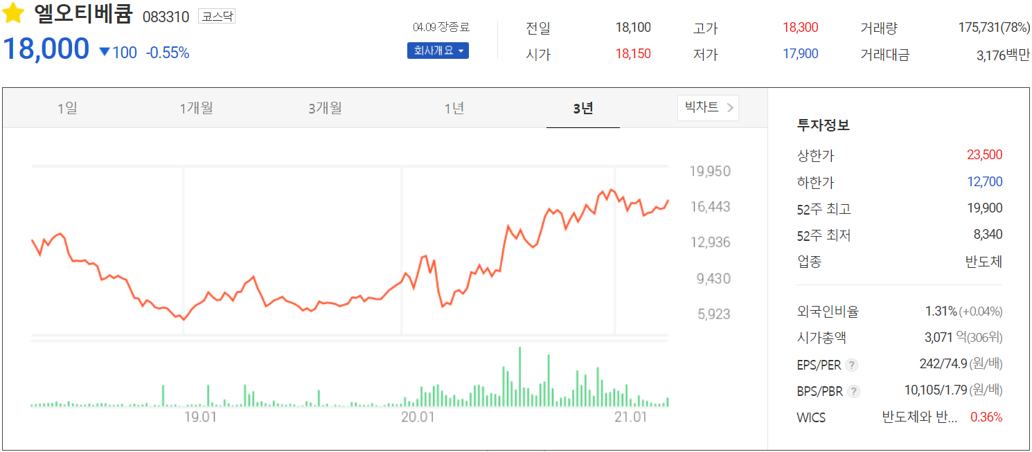 4월 9일 장종료 기준 당사의 주가는 18,000원에 거래를 마감했습니다. 외국인 비중은 1.31%이며, 시가 총액 3,071억 원으로 코스닥 시총 상위 306위 종목입니다.