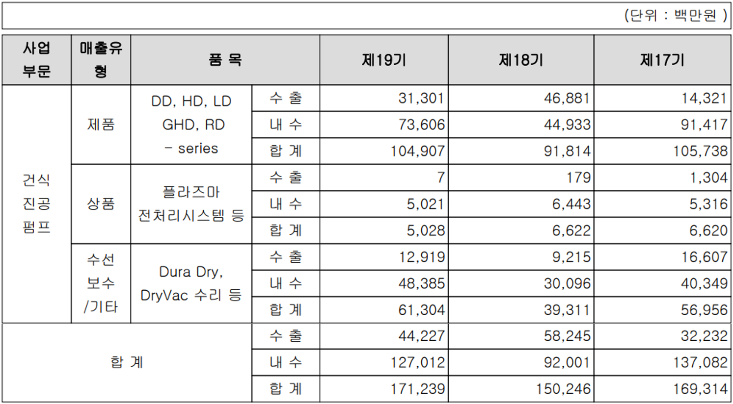 당사의 주요 사업부문은 반도체, OLED 디스플레이, 태양광, 2차전지 및 일반 산업 제조용으로 사용되는 건식 진공펌프의 제작 및 공급으로 구성되어 있습니다. 지난해 건식 진공펌프의 매출은 전체 비중의 61.3%를 차지하였으며, 수선 유지보수로 인한 매출이 35.8%의 비중을 나타냈습니다.