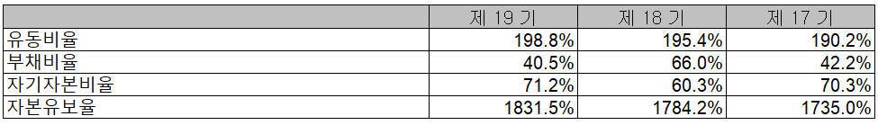 당사의 2020년 재무 안정성 비율을 보면, 유동비율 198.8%, 부채비율 40.5, 자기자본비율 71.2%, 자본유보율 1,831.5%로 건실하고 안정적인 재무 구조를 유지하고 있습니다.