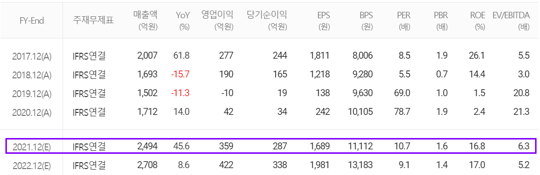 당사의 2021년 실적 추정지는 매출액 2,494억 원으로 전년 대비 45.6% 증가하고, 영업이익은 359억 원으로 755% 증가, 당기순이익은 287억 원을 기록하면서 744% 증가할 것으로 내다봤습니다.