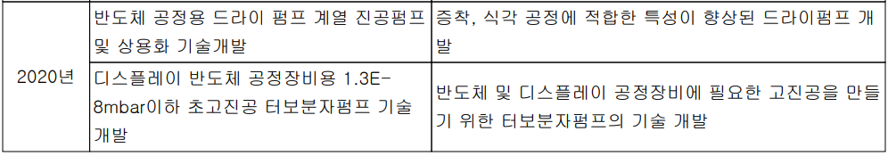 당사는 지난해 5월 반도체 공정용 드라이 펌프 및 반도체 및 디스플레이 공정용 초고진공 터보 분자 펌프 등 2건의 국책과제 기업으로 선정되어 현재 개발이 진행 중에 있습니다.