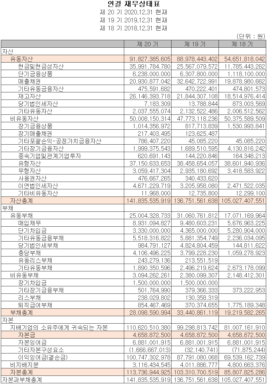 당사의 자산은 전년 대비 3.7% 증가한 1,418억 원으로 현금성 자산 및 재고 자산의 증가가 반영되었습니다. 부채는 16% 감소한 281억 원으로 차입금 상환 등으로 인한 감소가 있었습니다.