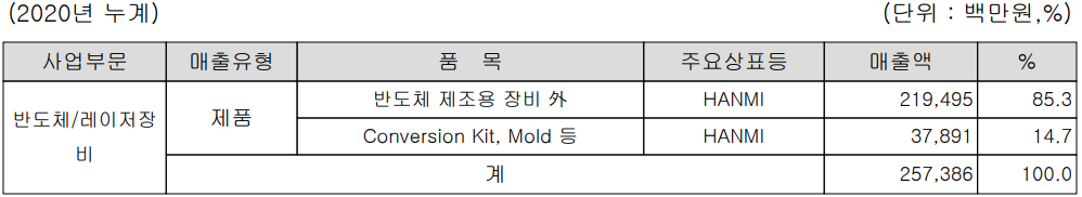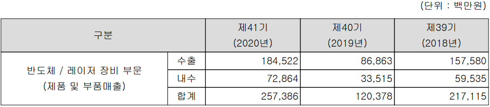 지난해 반도체 제조용 장비의 매출은 85.3%의 비중을 차지하였고, 기타 Conversion kit 등의 부속품 매출이 14.7%를 기록하였습니다.