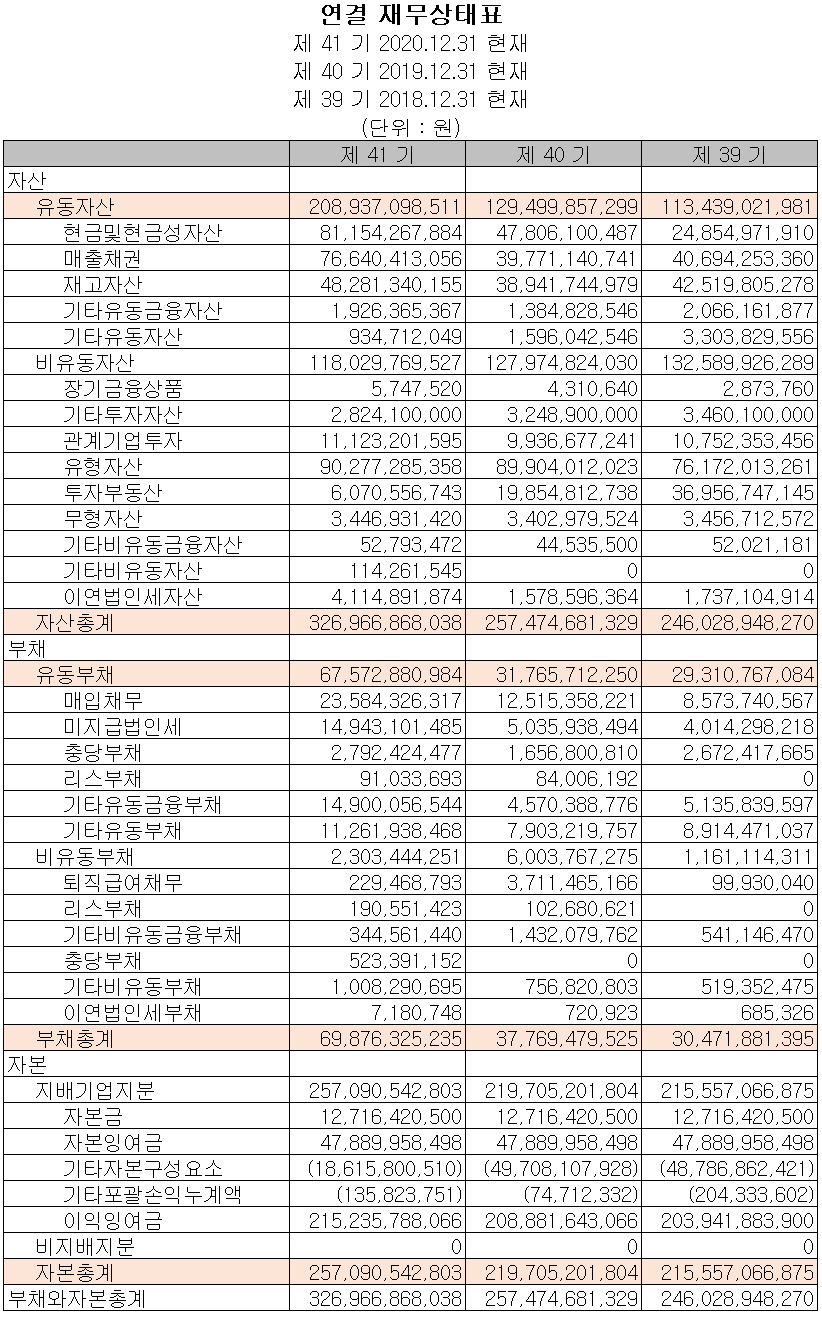 2020년 당기 말 기준 자산은 전년 대비 27% 증가한 3,270억 원으로 실적 증가에 따라 현금성 자산, 매출 채권 및 재고 자산 모두가 증가하였습니다. 부채는 85% 증가하여 699억 원으로 매입채무, 미지급 법인세 등의 증가가 있었습니다.