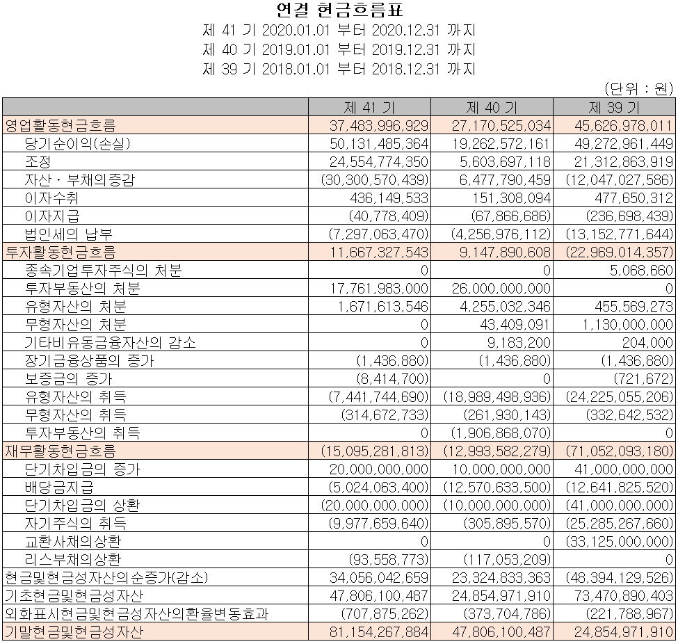 영업활동인해 꾸준히 현금을 창출하고 있으며, 유형 자산의 취득 등 투자활동도 지속적으로 하고 있으나 투자 부동산 처분에 따라 투자활동 현금흐름이 플러스 상태를 유지하고 있습니다. 2020년 기말 현재 당사의 현금성 자산은 812억 원입니다.