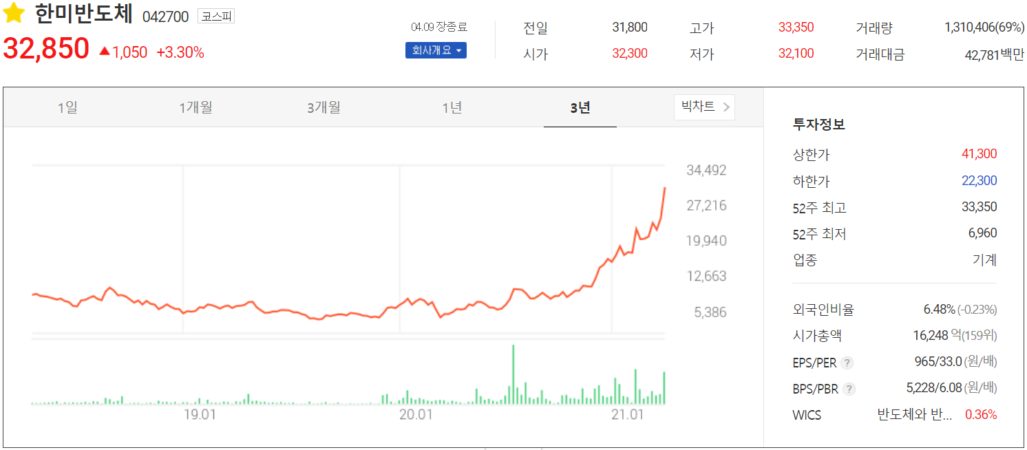4월 9일 장 종료 기준 당사의 주가는 32,850원으로 거래를 마쳤습니다. 외국인 비중은 6.48%이며, 시가 총액 1조 6,248억 원으로 코스피 시총 상위 159위 종목입니다.