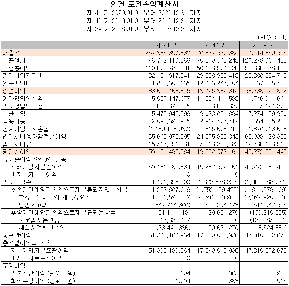 당사의 2021년 실적 추정치는 매출액 3,258억 원으로 전년 대비 26.6% 증가하고, 영업이익 912억 원으로 37% 증가, 당기순이익 713억 원으로 42.3% 증가할 것으로 추정했습니다. 한편 얼마전 당사의 곽동신 부회장이 언론과의 인터뷰에서 2021년 매출 목표를 3080억 원으로 세웠다고 밝혔습니다.