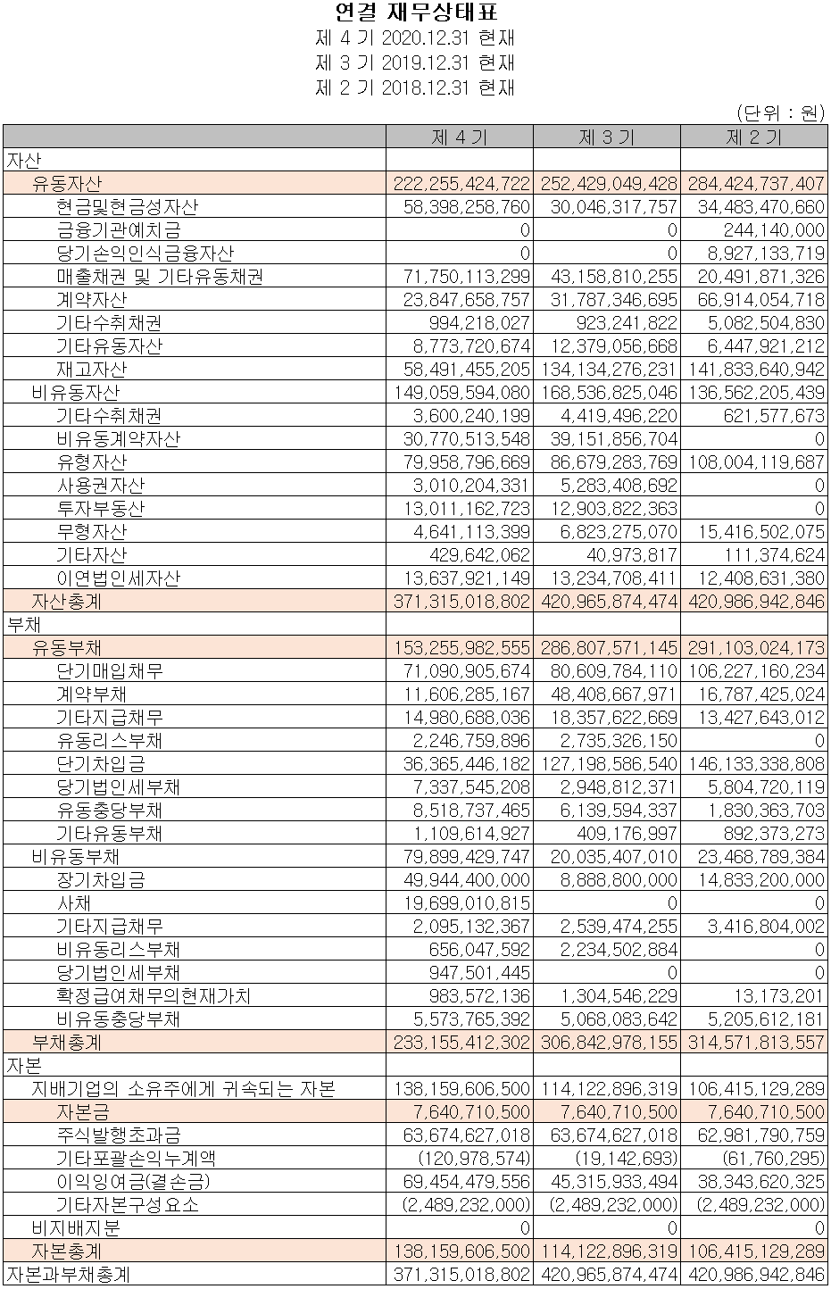 2020년 당기 말 현재 당사의 자산은 전년 대비 11.8% 감소한 3,713억 원을 기록하였습니다. 계약 자산 및 재고 자산의 감소가 전반적인 자산 감소의 요인입니다. 부채는 24% 감소한 2,332억 원으로 단기 차입금의 상환 등에 따른 감소가 있었습니다.