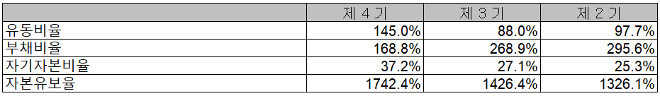 당사의 재무 안정성 비율에서는 유동비율 145%, 부채비율 168.8%, 자기자본비율 37.2%, 자본유보율 1,742.4%를 기록하였습니다. 부채비율이 비교적 높은 편이지만 꾸준히 감소 추세에 있어 긍정적으로 봐도 될 것 같고, 기타 전반적인 재무상태는 양호한 상태를 유지하고 있습니다.