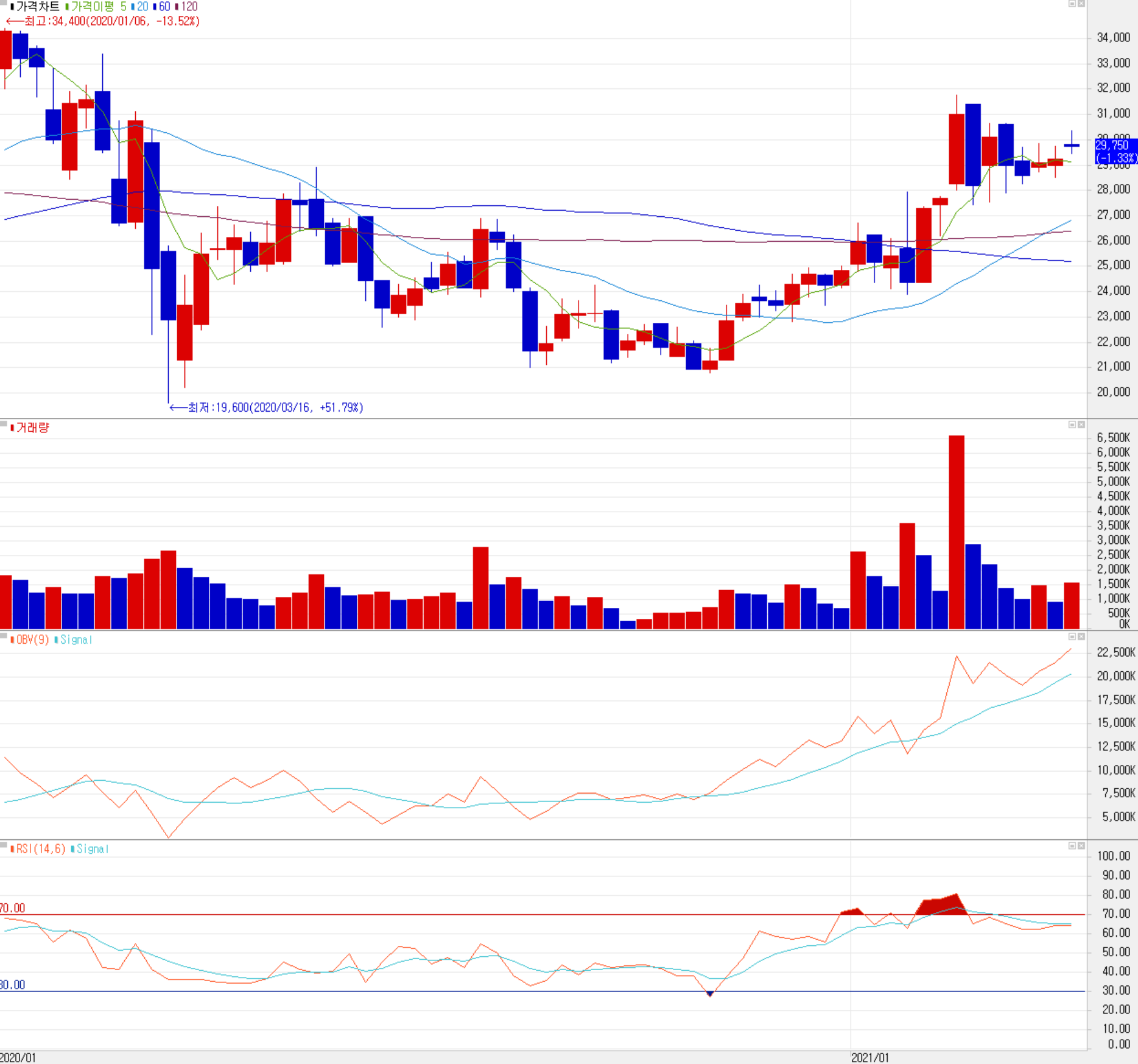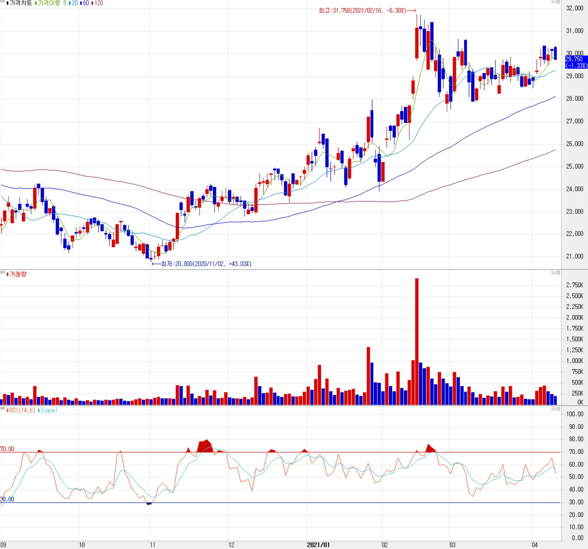 당사의 주가는 지난해 3월 코로나19로 인한 팬데믹으로 급락 시 최저치인 19,600원을 기록한 후에 반등을 시도했으나 상당기간 하락 추세를 보이다가 11월 들어서면서 반도체 슈퍼사이클의 도래와 함께 주가가 움직이기 시작했습니다. 특히 올해 2월 들어서 중소형 OLED에 대한 전방산업의 투자가 확대된다는 소식에 급등하면서 최고치인 31,750원을 기록한 후 최근에는 30,000원 근처에서 머물고 있습니다. 2021년 실적 전망치와 차트 관점을 종합하여 개인적인 목표주가는 39,000원으로 설정하였습니다. 지난 5 거래일 횡보하던 주가는 이번 주 방향성을 줄 것으로 보이며, 상승 시 33,000원 근처에서 저항이 예상되고, 하락 시에는 28,000원을 1차 지지로 보고 있습니다.