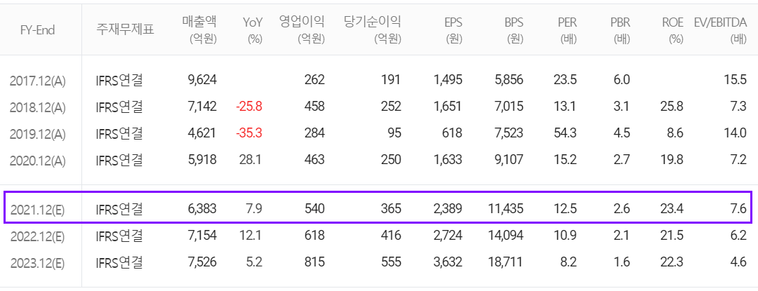 당사의 2021년 컨센서스는 매출액 6,383억 원으로 전년 대비 7.9% 증가하고, 영업이익 540억 원으로16.6% 증가, 당기순이익 365억 원을 기록하면서 46% 증가할 것으로 추정했습니다. 중화권 디스플레이 업체 등 국내외 디스플레이 업체들의 투자 확대에 따른 기대감이 추정치에 반영된 것으로 판단합니다.