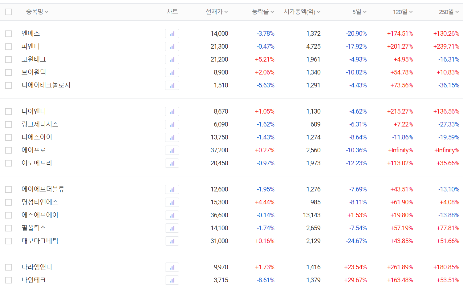 장비 관련 섹터에서는 테슬라 배터리데이 전후 변동성이 심했지만 나라엠앤디와 나인테크는 지난주 각각 23.54%, 29.67% 상승하면서 장을 마감했습니다.