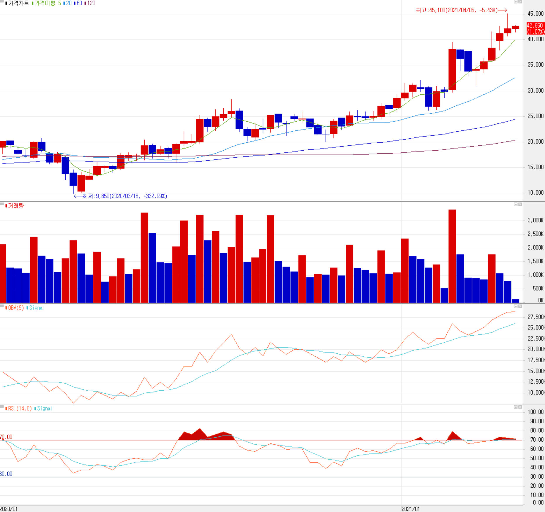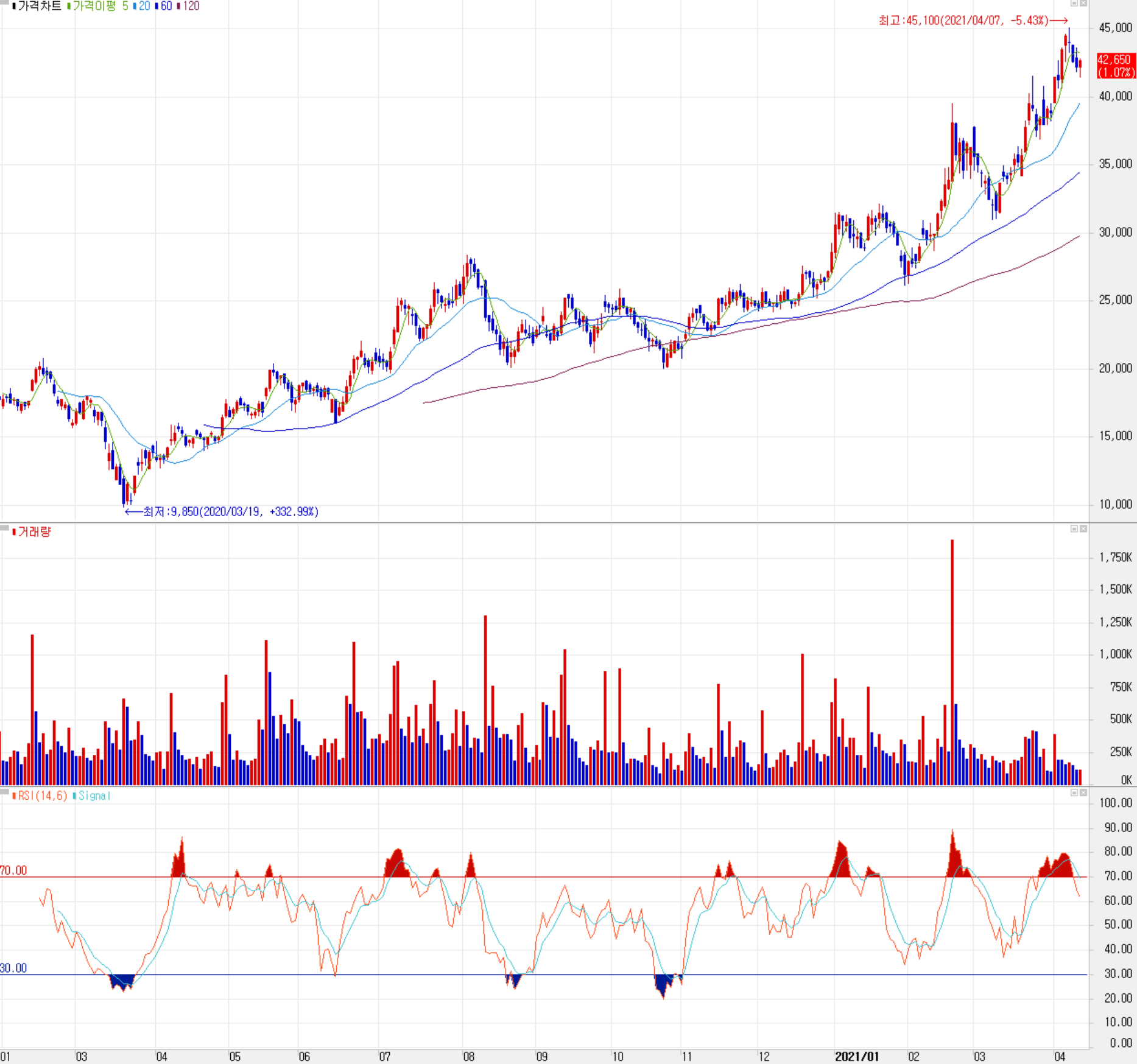 당사의 주가는 지난해 3월 코로나19로 인한 급락 이후 꾸준한 상승 추세를 보이고 있습니다. 지난주 5일 이평선 밑으로 내려오면서 급등에 따른 매물 소화 과정을 거치는 중으로 보고 있습니다. 최근 수급에서는 외국인의 매수세가 강한 상황이고, 기관과 개인은 매도 우위를 보이고 있습니다. 컨센서스와 차트 관점을 종합하면 개인적인 목표주가는 56,000원에 설정하고, 추가 하락 시에는 39,500원 부근에서 지지 여부, 반전 시에는 46,500원 선에서 저항이 예상됩니다.