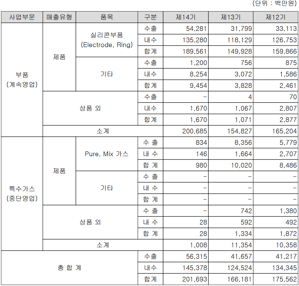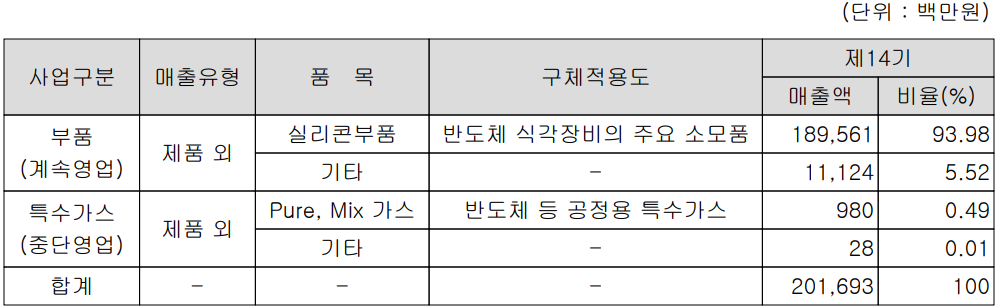 당사의 사업 부문은 실리콘 및 실리콘 카바이드 등 반도체 식각 공정용 장비에 적용되는 부품 사업 부문과 반도체 공정용 특수가스 부문으로 구분됩니다. 지난해 부품 사업부문의 매출은 전체 매출의 93.98%를 차지하였고 특수가스 부문은 당기 중 2020년 2월 (주)솔머티리얼즈에 매각하였습니다.