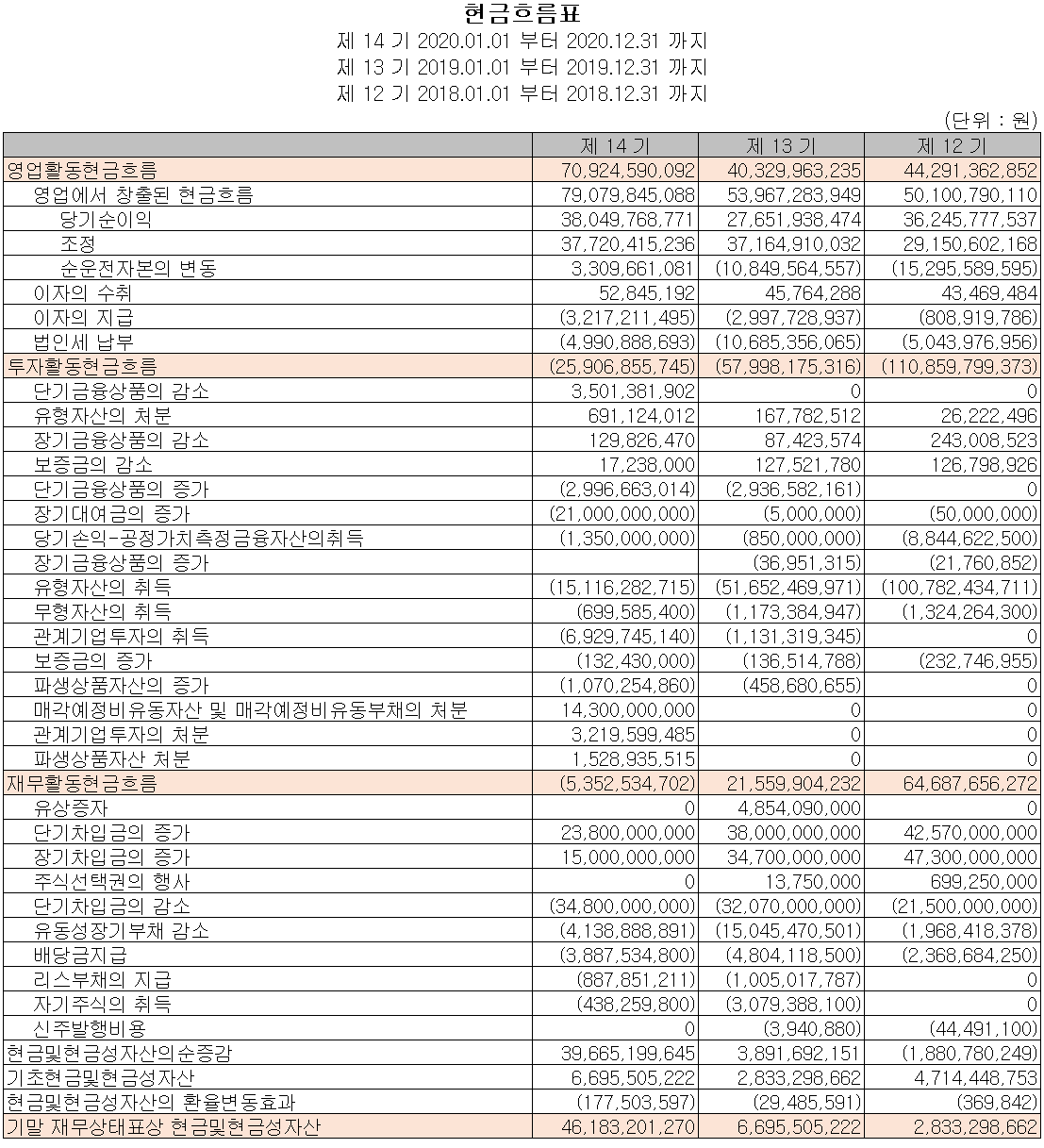당사는 영업활동으로 꾸준한 현금을 창출하고 있으며, 지난해 실적 개선에 따라 306억 원 증가한 709억 원의 현금 유입이 있었습니다. 확보된 현금과 장단기 차입금의 조달을 통한 투자활동도 지속되는 모습입니다. 2020년 당기 말 기준으로 현금 및 현금성 자산은 전년보다 395억 원 증가한 462억 원입니다.