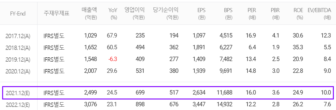 당사의 2021년 컨센서스는 매출액 2,499억 원으로 전년 대비 24.5% 증가하고, 영업이익은 699억으로 31.6% 증가, 당기순이익은 36% 증가하면서 517억 원을 달성할 것으로 추정했습니다.