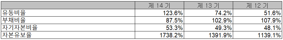 하나머티리얼즈 2020년 주요 재무 비율은 유동비율 123.6%, 부채비율 87.5%, 자기자본비율 53.3%, 자본유보율 1,738.2% 를 기록하면서 전반적으로 유동비율의 증가, 부채비율의 감소가 보이며 양호한 재무 상태를 유지하고 있습니다.